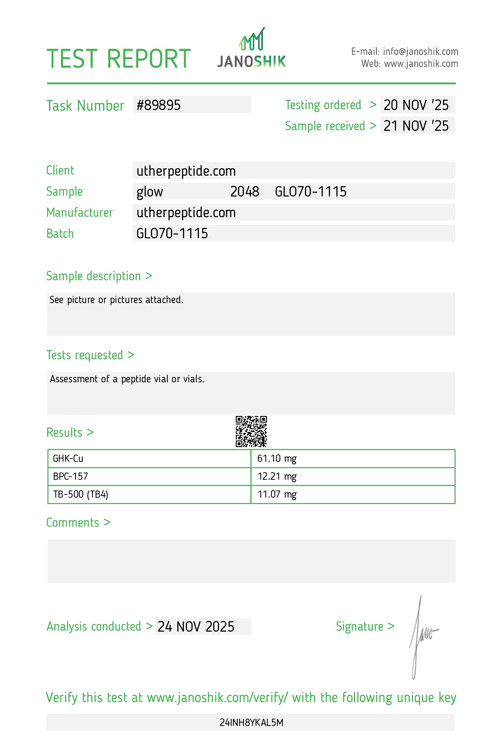 GLOW is a peptide blend. This is a blend of GHK-Cu 50 MG, BPC-157 10 MG, and TB-500 10 MG in a single vial.